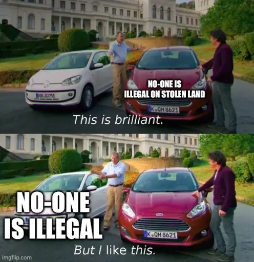 image comparing two cars. a person calls the first car brilliant captioned [no-one is illegal on stolen land]
