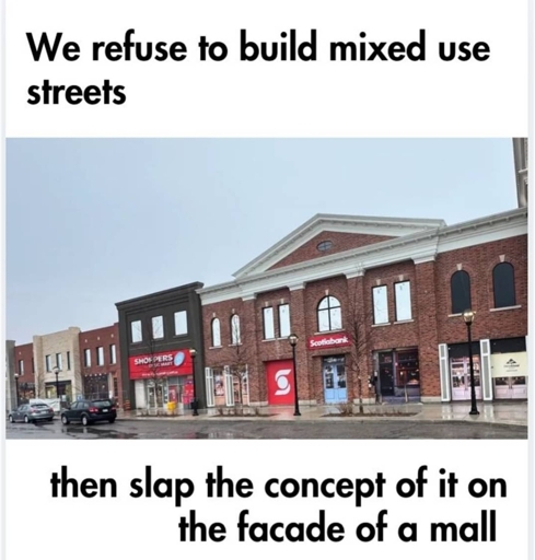 minus-squareCorneliusTalmadge@lemmy.worldlinkfedilinkEnglisharrow-up18·16 days agoIn suburban areas of the US and Canada, mixed use buildings are generally not allowed. Mixed use meaning retail space one the ground level with apartments/ condos above. However, some of these shopping centers are built to give the appearance of mixed use space to give it a more “luxurious” appearance. So the post is implying that the second floor of the building is fake. Another commenter has pictures of before and after the remodel that added the “fake” second floor.