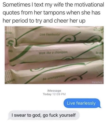 Swear to god, if I unwrap a tampon that says “help, I’m trapped in a fortune cookie factory”…
