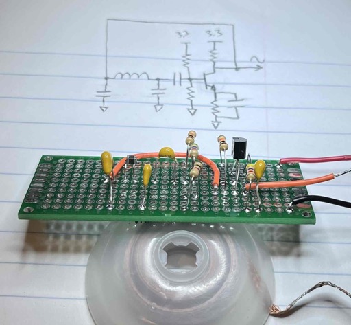 This is known as a Colpitts oscillator and I soldered this up last night after dinner. To my surprise it worked on the first try! With the component values I used it oscillates between 0.7-2.8V at a frequency of 1.28 MHz.