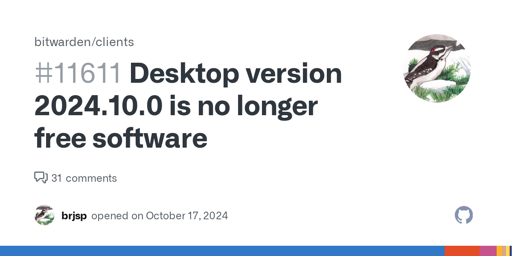 tifriis@sh.itjust.works to Linux@lemmy.ml · 1 year agoDesktop version 2024.10.0 is no longer free software · Issue #11611 · bitwarden/clients · GitHubgithub.comexternal-linkmessage-square2linkfedilinkarrow-up10arrow-down10