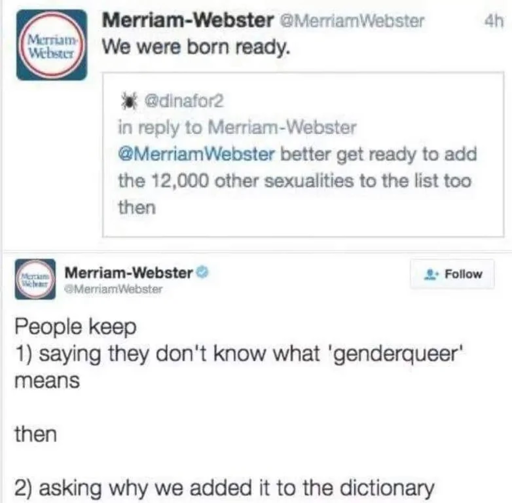 Merriam dgaf. Their job is to figure out what words people are using, and document them. People could invent the word “bumblesausagecock” and if it caught on, they would add it.