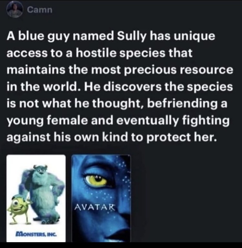 [In bolded letters] A blue guy named Sully has unique access to a hostile species that maintains the most precious resource in the world. He discovers the species is not what he thought, befriending a young female and eventually fighting against his own kind to protect her.