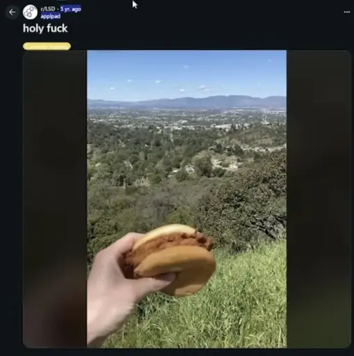 That burger looks way to dry to be delicious AF on acid, but I can definitely recommend climbing on a hill in the summer and dropping Acid.