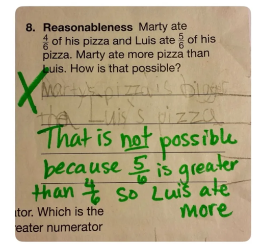 The “correct” answer is just straight up wrong; it definitely is possible. If the kid was older, it might have to calculate how much bigger it is.This is genuinely baffling. What was that teacher on.