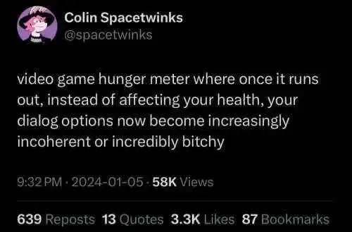 minus-squarewhysteria@lemmy.blahaj.zonelinkfedilinkEnglisharrow-up9·3 months agoI get visual disturbance and nausea debuffs with my hunger too (°▽°)