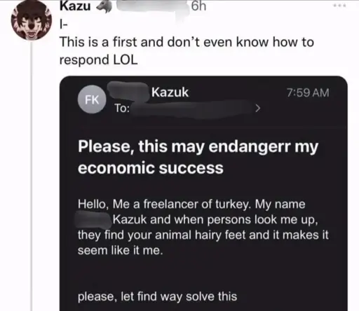 I never got contacted about this but my old fursona’s name apparently overlapped with some French dental surgery study facility. I had no clue when I came up with the name. Derp. X3