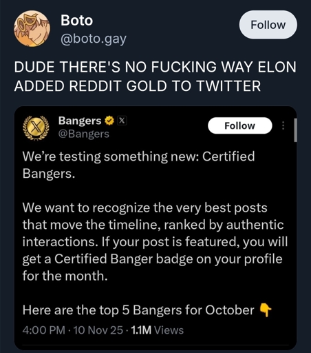 ZILtoid1991@lemmy.world to 196@lemmy.blahaj.zoneEnglish · 1 month agoXitter gold rulelemmy.worldimagemessage-square28linkfedilinkarrow-up1339arrow-down15