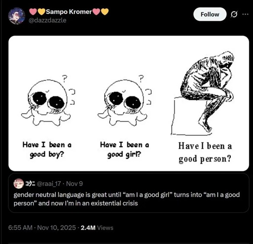 Twongo [she/her]@lemmy.ml to 196@lemmy.blahaj.zone · 1 month agoneutral language rulelemmy.mlimagemessage-square33linkfedilinkarrow-up1467arrow-down14