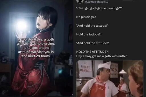“Can i get goth girl, no piercings?” No piercings?! “And hold the tattoos!” Hold the tattoos?! “And hold the attitude!” HOLD THE ATTITUDE?! Hey Jimmy,get me a goth with nuthin”