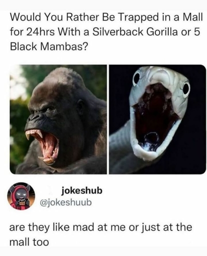 arrow-up14arrow-down1imageGorillas are actually very gentle unless provoked by overpriced footwear or long lines for cheap beverageslemmy.dbzer0.comSnokenKeekaGuard@lemmy.dbzer0.com to Lemmy Shitpost@lemmy.world · 2 years agomessage-square20linkfedilink