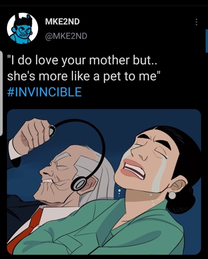 Omniman is tries to convert Invincible into joining their empire, and to join him in conquering the planet. Invincible asks if he cares about the people, any of them; does he love his wife/Invincible’s mom. Omniman says the line in the meme.