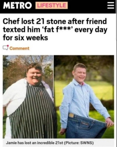 I too have been struggling with my weight for most of my life (the worst was 135 kilos at 189cm height, usually sitting around 95-100). I have been occasionally made fun of as a kid for it too, so I’m happy treating fat people like shit isn’t that acceptable any more.