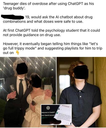 People got mad at me for pointing out this is the case when people die because they listen to an AI chatbot, but it’s true. AI 100% needs more regulation, but introduce any new tool to everyone all at once, and some idiots will use it to remove themselves from the gene pool. If you sent everyone in the world a thin, 2in rod of inert iron, there would be a handful of people who would figure out a way to kill themselves with it.