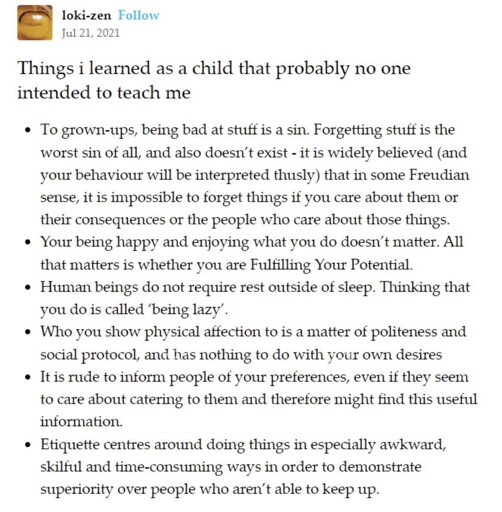 What are you doing here, anyway? You see a post indicating the things that someone has learned through childhood trauma, and just make it your mission to invalidate all of their experiences? For those of us who have experienced the same trauma (mostly us neurodivergent folks), this post serves as a relatable way to lighten our mood, by acknowledging our shared trauma. There is nothing “dark” or “upsetting” about this to anyone with a soul. If your first instinct when hearing about the grievances someone has with the world is to attack them for speaking their truth, then I hardly have to wonder what kind of person you are.