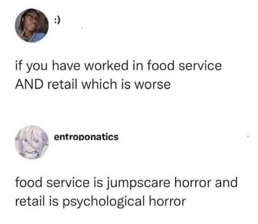 For me food service was worse because it was harder to get breaks. In retail I could just tell bad customers “I’ll check the warehouse”, and then never return. But at the restaurant I couldn’t opt out of bad customers.