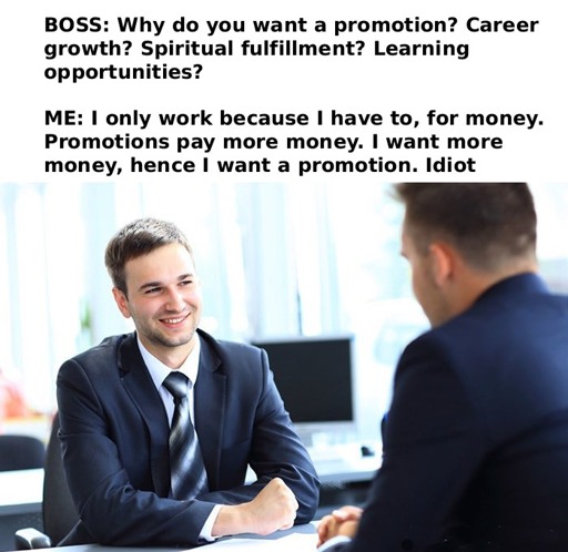 Sure, but I don’t want the promotion because I’m some wonderful leader and strategist, I want the promotion so I can have more money because being alive is expensive