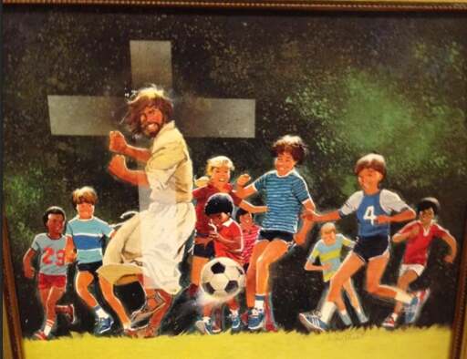 Christ on the offense, clearly offsides as he leaves the children in the dust, yet not being called on it because being “without sin” evidently extends to all sporting events.